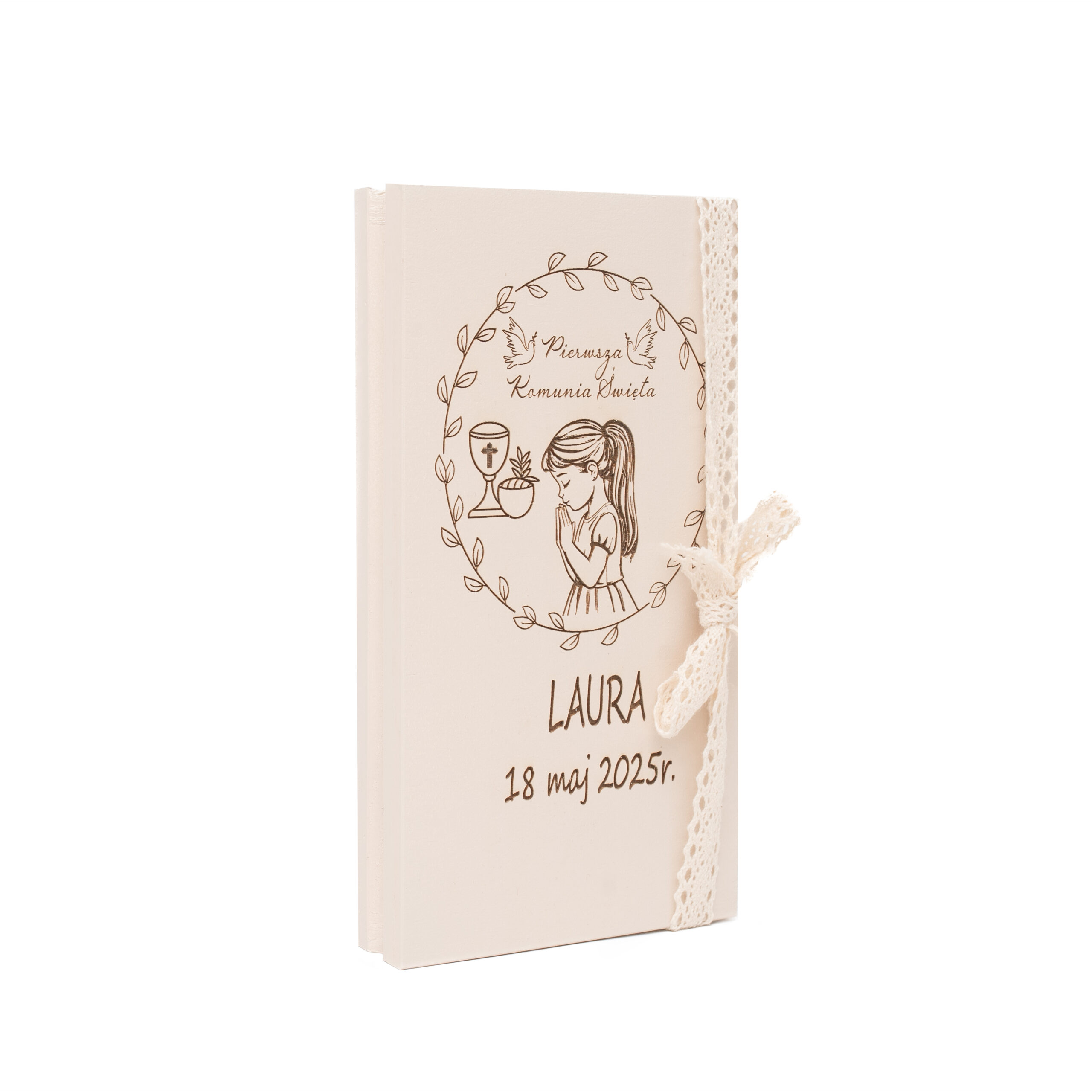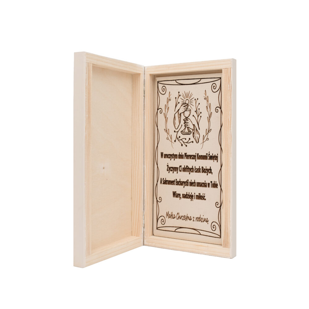 Eleganckie drewniane pudełeczko z życzeniami na okoliczność Pierwszej Komunii Świętej dla dziewczynki.
